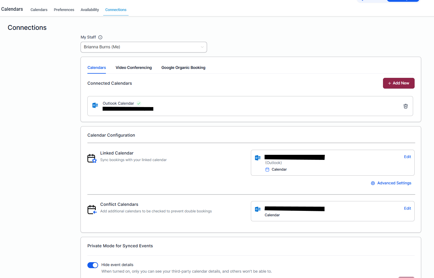 Conflict Calendars are connected calendars (or linked calendars) that AE Sync checks to block availability.