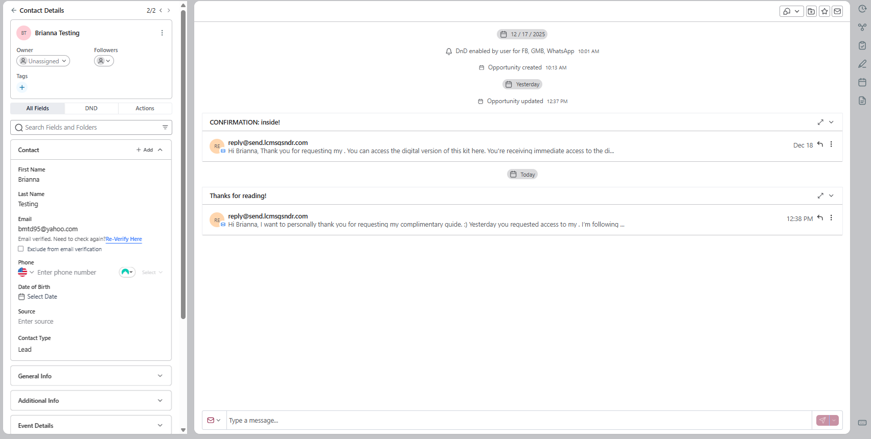 Left Panel – Core contact information (name, email, phone number, tags, DND status, and quick actions)